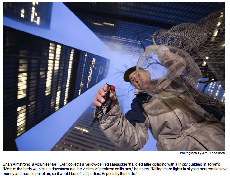 We've lit up the night as if it were an unoccupied country, when nothing could be further from the truth. Among mammals alone, the number of nocturnal species is astonishing. Light is a powerful biological force, and on many species it acts as a magnet, a process being studied by researchers such as Travis Longcore and Catherine Rich, co-founders of the Los Angeles-based Urban Wildlands Group. The effect is so powerful that scientists speak of songbirds and seabirds being "captured" by searchlights on land or by the light from gas flares on marine oil platforms, circling and circling in the thousands until they drop. Migrating at night, birds are apt to collide with brightly lit tall buildings; immature birds on their first journey suffer disproportionately.