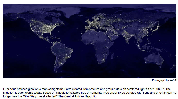 Now most of humanity lives under intersecting domes of reflected, refracted light, of scattering rays from overlit cities and suburbs, from light-flooded highways and factories. Nearly all of nighttime Europe is a nebula of light, as is most of the United States and all of Japan. In the south Atlantic the glow from a single fishing fleet—squid fishermen luring their prey with metal halide lamps—can be seen from space, burning brighter, in fact, than Buenos Aires or Rio de Janeiro.